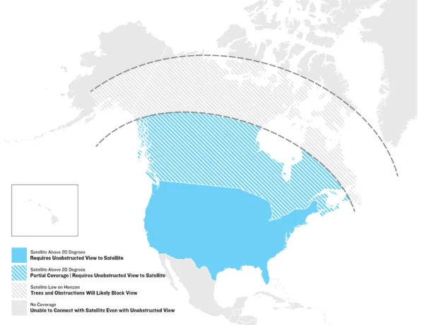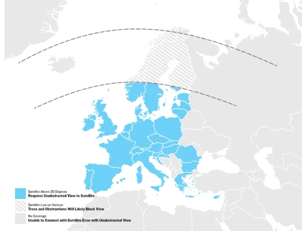 Your fēnix 8 Pro smartwatch uses a satellite connection for off-grid connectivity. Because these satellites are in a geostationary orbit, your watch must be able to “see” the satellite above the horizon to receive the signal. Trees, terrain or buildings may obstruct the signal connection, requiring you to move to an area with a clear view of the sky. In areas of the globe above 65 degrees north, the satellite network will orbit below the horizon and thus is unable to provide a clear connection.